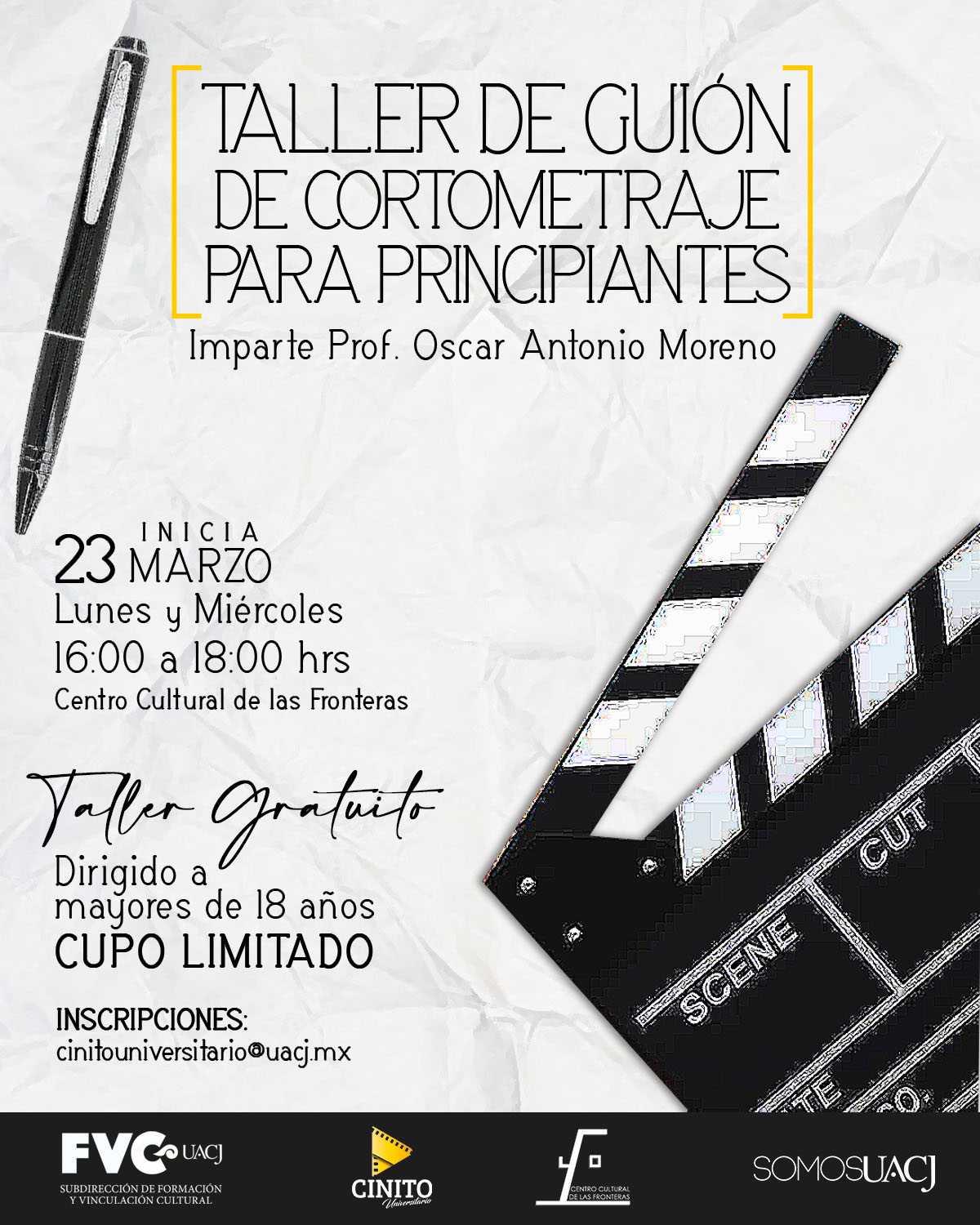 Taller de Guión de cortometraje para principiantes impartido por el Prof. Oscar Antonio Moreno